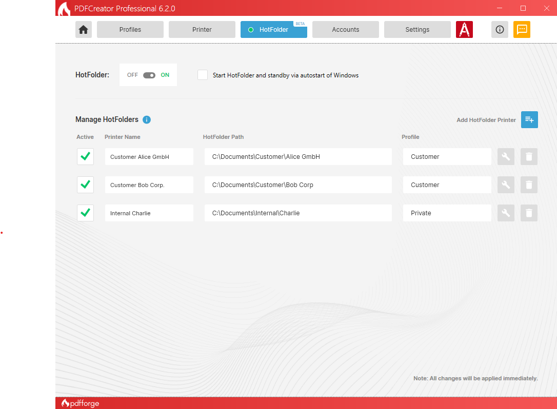 HotFolder is now fully built into PDFCreator Professional and Terminal Server. It automatically watches selected directories and converts any new files placed there. This new feature is currently in the beta stage, so your feedback is appreciated.